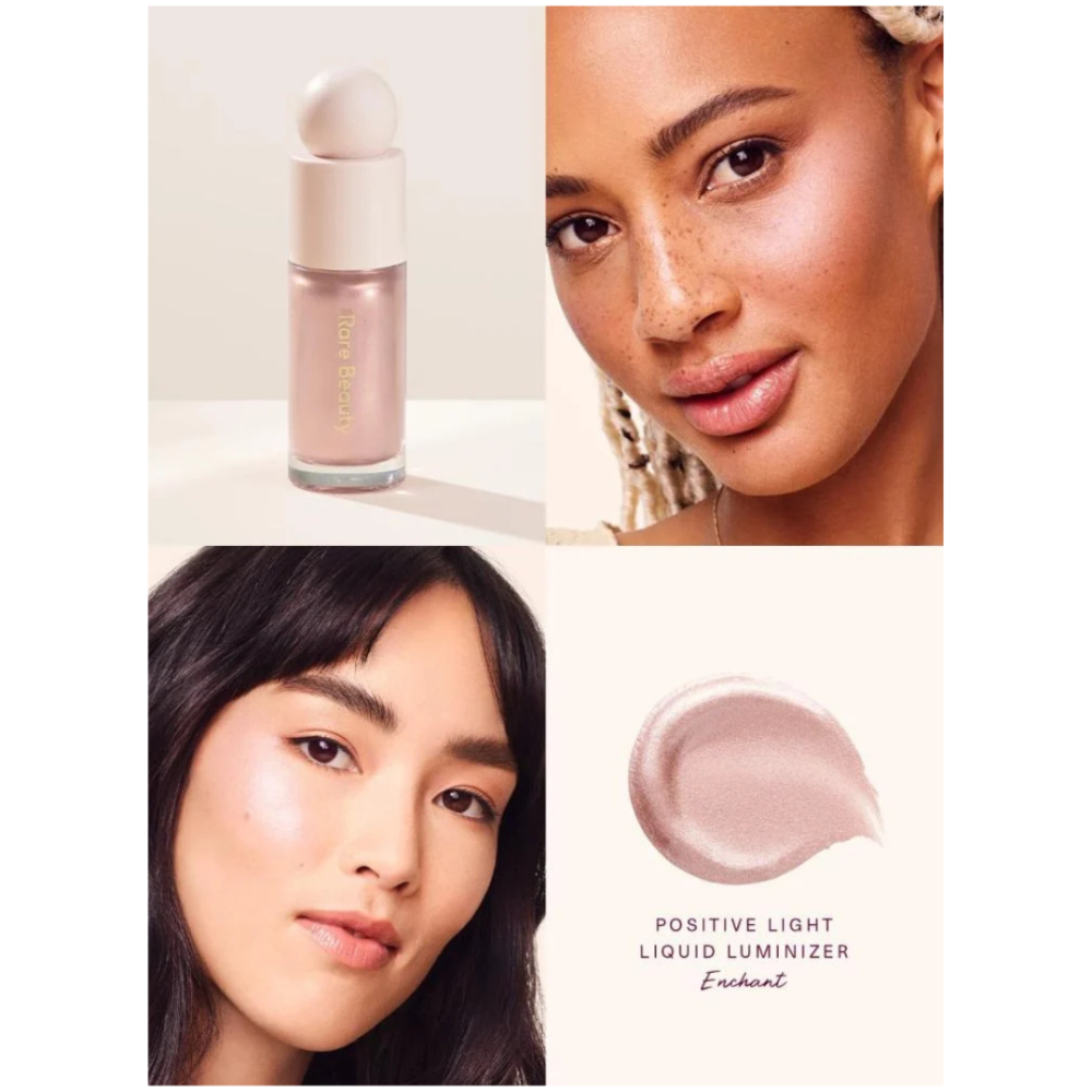 امنحي بشرتك إشراقة ناعمة طبيعية مع هايلايتر رير بيوتي بوزيتيف لايت سائل shade Enchant من Rare Beauty – تركيبة مبتكرة وخفيفة الوزن تمنحك توهجًا ورديًا لؤلؤيًا يدوم طوال اليوم.