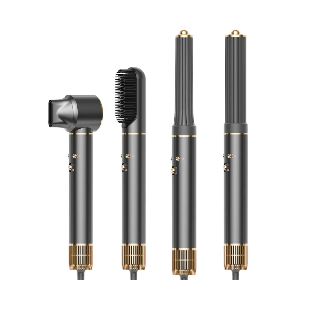 - 🔹 5 ملحقات قابلة للتبديل: مملس – فرشاة دائرية – مموّج – مكثف هواء – فرشاة تنعيم.